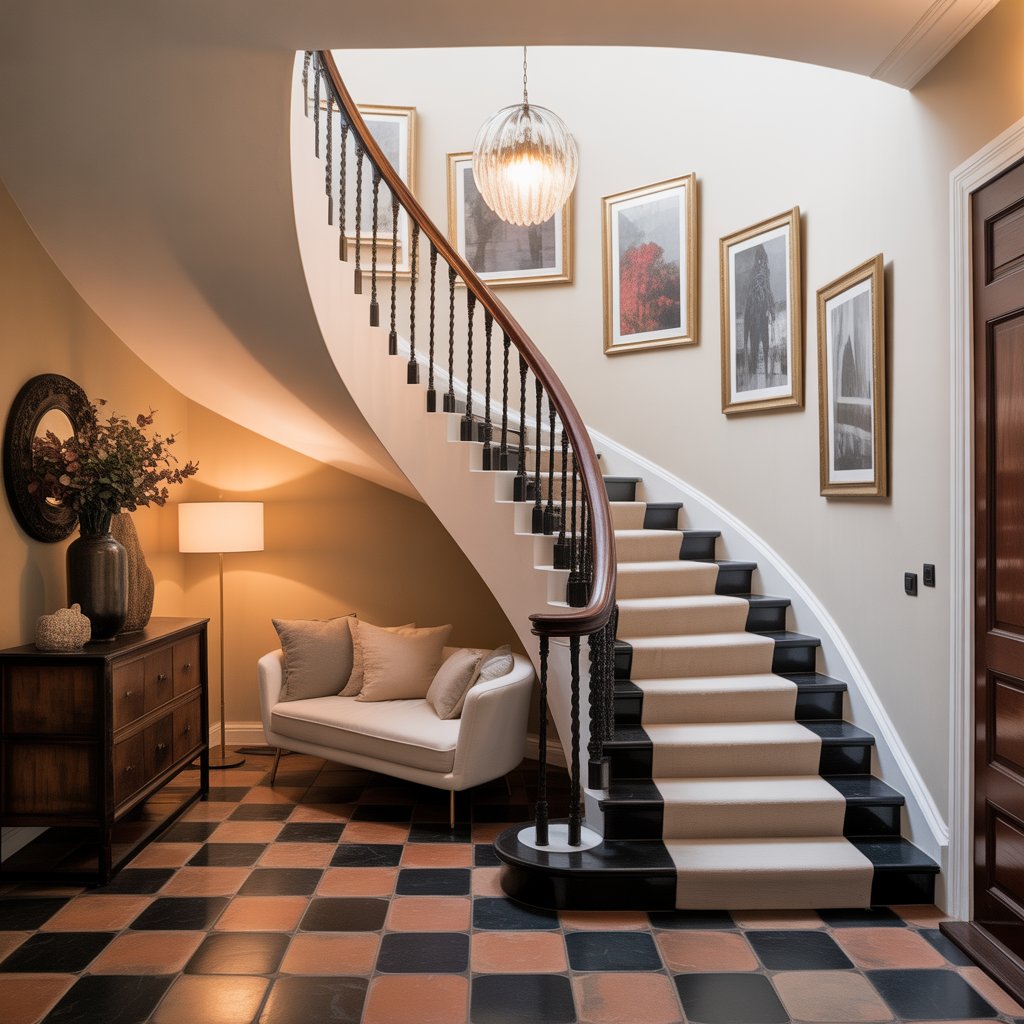 A curved staircase in the entryway adds charm and style to your home. Combining metal wall art, modern sculptures, and elegant lighting creates a balanced look. Pieces like golden metal sculptures or abstract geometric panels bring life to blank walls.
