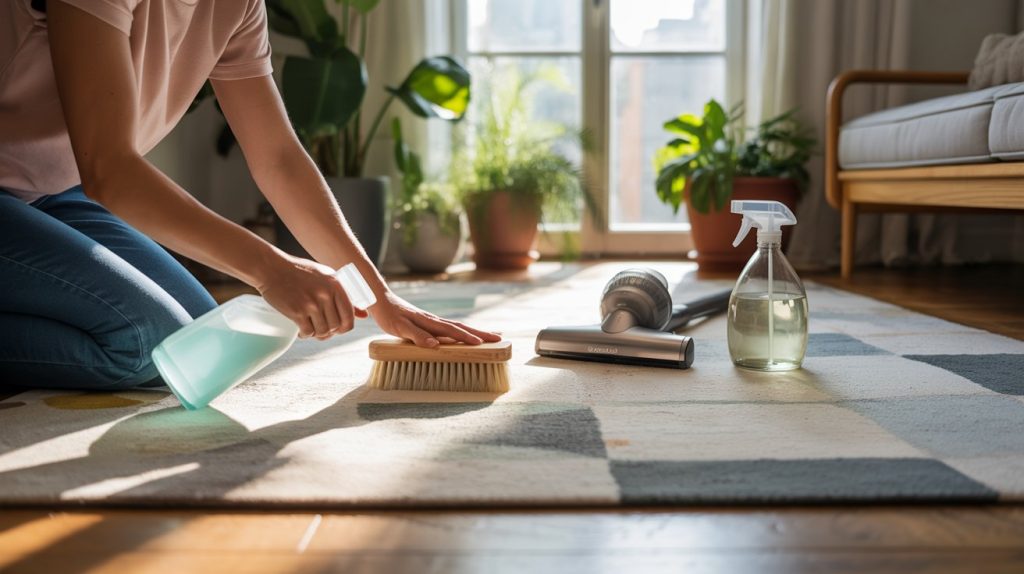 Create your own cleaning solutions at home. Mix vinegar with water for a simple spray. Add a few drops of essential oils for a pleasant scent. Baking soda helps lift stains. Sprinkle it on the rug before vacuuming. These solutions are safe and effective.