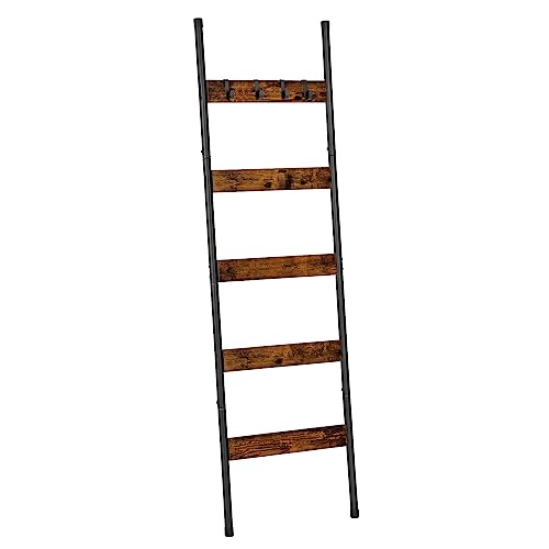 HOOBRO Blanket Ladder, 5-Tier Towel Rack with Hooks, Wall-Leaning Blanket Rack, Decorative Display Ladder Shelf, for Scarves, Industrial, Living Room, Bedroom, Rustic Brown and Black BF52CJ01