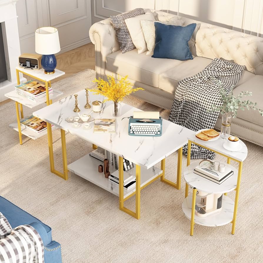 Coffee tables and side tables provide both function and flair. White marble tops with gold metal bases are popular for adding elegance without overwhelming the space. They’re easy to clean and perfect for holding drinks or decor.